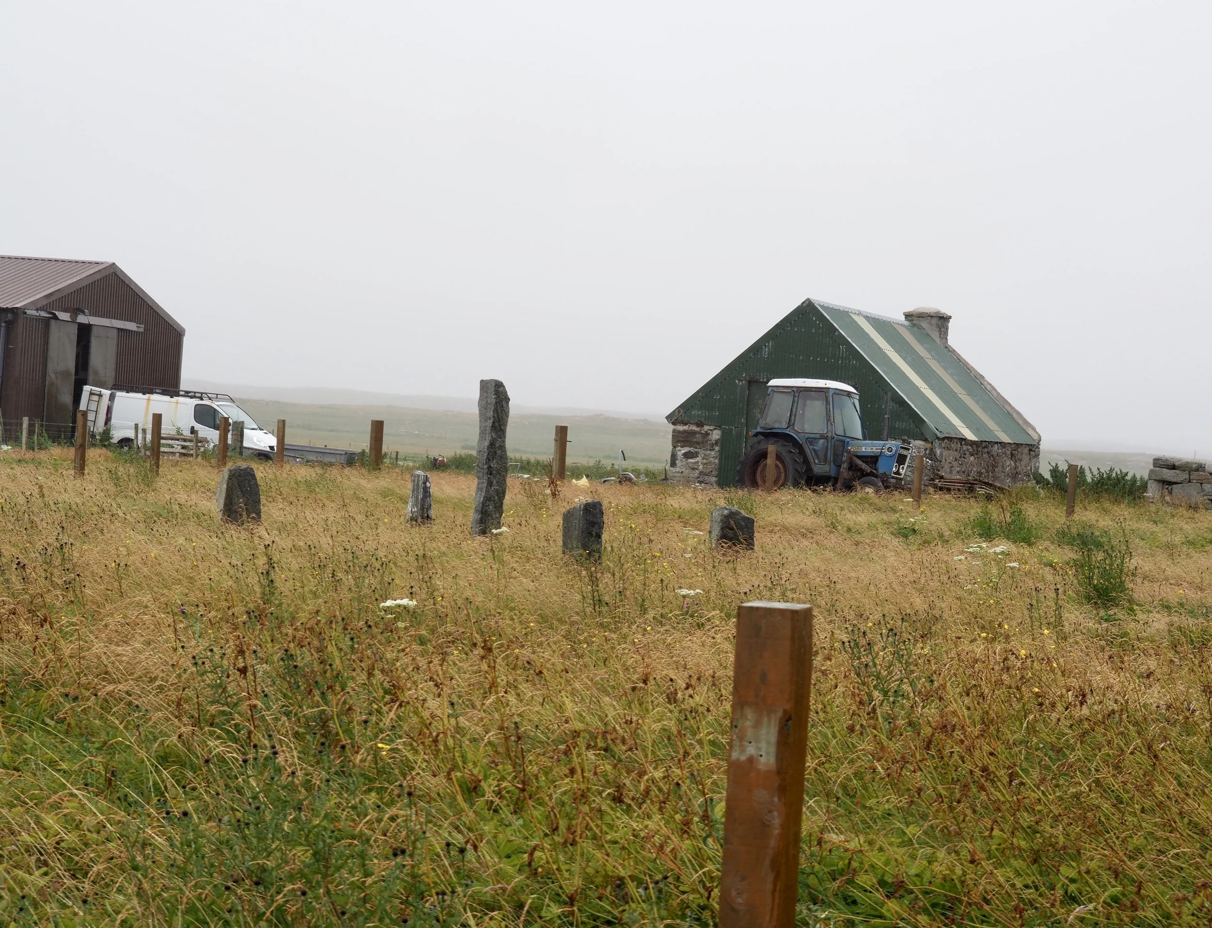 This was an early morning. We woke up to heavy wind gusts and rain. I knew it would take some extra time to make it to the ferry to Uist, and we had to be there by 8am. Normally, it was supposed to take around 40 minutes. We got on the road at 7, and at first, everything looked great. It is early for Scotland (well, maybe except for the ranchers, farmers, and fishermen), so there wasn’t anyone on the road. We made it through Tarbert, and hit the one-track section. There was a heavy truck, and a few camper vans trailing it. It was slow going. But, we made it in plenty of time. Parked in our queue, it was clear that this wasn’t going to be a large ferry. There were only 3 lanes of vehicles, including the heavy goods vehicles. With the massive wind, we were prepared for a rough crossing. We got on the ferry, parked, and went upstairs to the small cabin. We got there in time to snag a table, and we set to importing and uploading pictures, and composing the blog. Oddly enough, the cel service on the ferry crossing was better internet than in the B&B.By the time we got what we wanted done, done, it was time to disembark. Since this was a small ferry, there were no concessions aboard, so we were hungry. We set out to find something to eat. We headed to Lochmaddy, which is where we will take the ferry to Skye this afternoon. Originally, we had planned to ferry from Harris to Skye directly, but the ferry was fully booked up several months in advance. So, we took a detour to the Uist islands, and then to Skye later in the day.In Lochmaddy, we found a cafe/museum, and got a light breakfast. We did enjoy the pot of tea - civilized, don’t you know. The weather outside was still blowing and raining, and you could barely see the neighboring seas. I’m sure these Outer Hebrides islands are much prettier when you can actually see. We found some neat crafts, and were able to refuel.This was a point of some anxiety, as motor services in outer areas are less dependably found. We looked on several maps, and some even recommended fueling on Harris before coming over. Well, it was too late for us when we saw that recommendation, as we were about 5 minutes from boarding the ferry. It ended up not being much of a problem. While shopping at a craft store (surprise, right?), we asked if there was a petrol station in town, and it ended up being about a quarter mile down the road. With our car refuelled, we continued down the main artery - connecting the four islands. We stopped off at a Puffin Craft shop, and I was disappointed that it was merely the name, not the theme. There were some cool items, and I got a Harris Tweed-covered flask. I don’t know if it will ever be used, but it looks cool.We saw some places we wanted to stop at on our way back, and made it almost down to the bottom island - Eriskay. Carrie wanted to go down there, because the island is filled with wild ponies. However, with the poor weather, we decided not to, and turned back north.We stopped at Flora McDonald’s birthplace. I’ve mentioned before about the love the Scottish people have for her - standing up to the English for Bonny Prince Charlie. The location was the ruin of a stone house with a monument in the middle. For all it’s import, Carrie was as excited to get some cow pictures in the neighboring field.As we worked our way north to the afternoon ferry, we stopped off at a jewelry shop. It was clear they actually made a lot of jewelry there, and it was highly priced. I was just excited to get some coffee. I wanted to try an experiment. At one of the craft stores earlier, we had bought some Hebridean “toffee”. The consistency when you bit into a piece, was more like loosely packed sugar. It tasted like toffee, but felt like a mouth full of brown sugar. I speculated that it would be good in coffee, so I tried it out. Luckily, the shop made their coffee super hot, so the toffee could dissolve. Though it took some extra swirling, I was vindicated - delicious!We took some pictures at a hillside statue - Our Lady of the Isles, and continued on. We figured that if we got back to Lochmaddy early enough, we could stop at that cafe and get some lunch before the ferry. We were successful, and barely beat the throng of other ferry passengers with the same idea. We got the ferry terminal, got our tickets, and got in line. It seemed like an eternity before loading in, and we parked and headed upstairs. I must note, that every time we have ridden a ferry, I have worried that I didn’t put the car in park, or put the emergency brake on. I just knew we would come down to the deck, and find a wreck. Unnecessary fears, I guess.We found a nice couch section next to a window on the top deck. This ferry was much larger, but apparently was heading to rougher seas, for as soon as we sailed, the boat was rising and falling a fair amount. Carrie was none to pleased. It was also a little warm in there, so we made our way to the rear observation deck, which was outside. It seemed to be a smoother ride, and with the blowing air, helped Carrie a lot. I got her some soda and crisps, and she felt better. It started getting cold, so I pulled out my cashmere gloves we bought earlier in the trip. Both because I didn’t want her to mess with the crisps, and because I didn’t want the gloves to get all messy, I fed her crisp by crisp, until she felt better.We made it to Skye with no chucks upped, and set off to find our B&B, Though I passed the entrance (poor signage), we were able to find it and unload. Carrie had called ahead to a restaurant for a table, as we were told it is quite busy in Skye, so we were already booked. I was stoked that our B&B room was on the first story. Stairs here are quite narrow, and challenging to porter our Everest Expedition up the mountain.Dinner was amazing, but by the end, Carrie was just about unconscious. She had taken medicine on the ferry, and it was really kicking in. We made it back, and went promptly to bed. We 